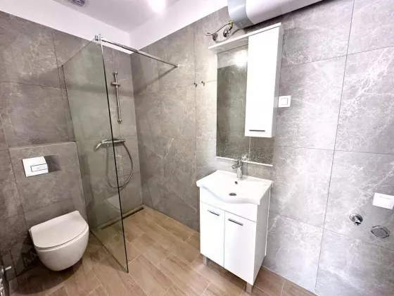 Новый дом в новом жилом комплексе. Удобная планировка. Новый ремонт из качественных материалов. Вид на море. На территории комплекса бассейн. Тёплые полы в санузлах. Управляющая компания - 1€ в мес. и возможность пользоваться бассейном.
